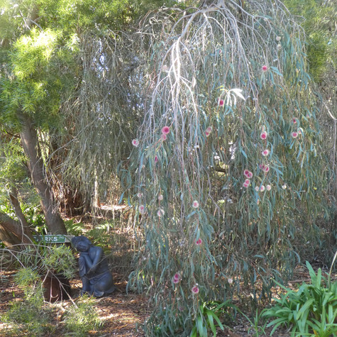 The tree teases us with its flowers. On the years it does decide to flower, little white balls start to appear. One early flower, impatient to make its presence felt, usually appears late autumn and just sits there, basking in its own beauty. We know more are coming so we check it daily and start counting the flowers. When there are more flowers than we have fingers to count on, the tiny honeyeaters start to arrive.